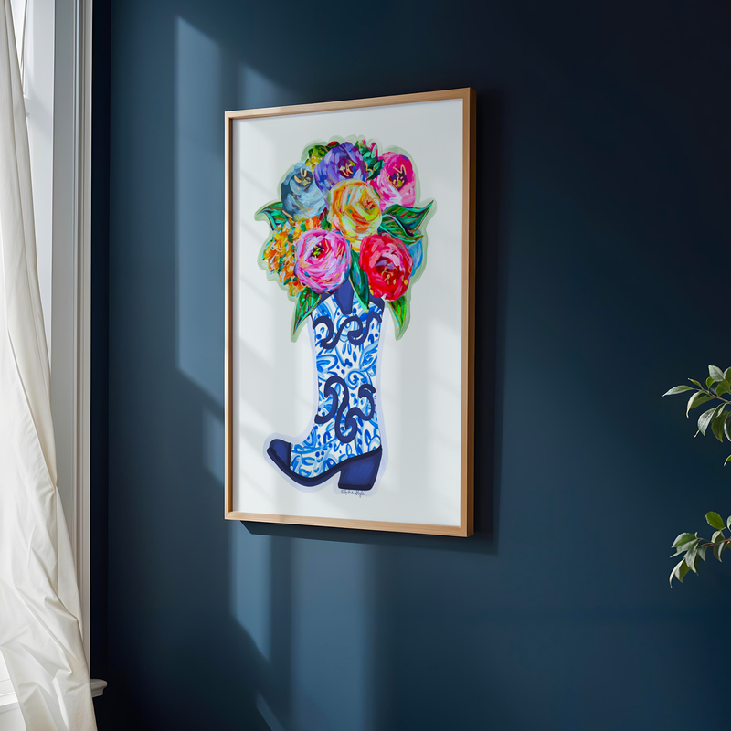 Boot Bouquet Art Print, Blue and White Maximalist Art, Dopamine Decor, Trendy Colorful Wall Poster