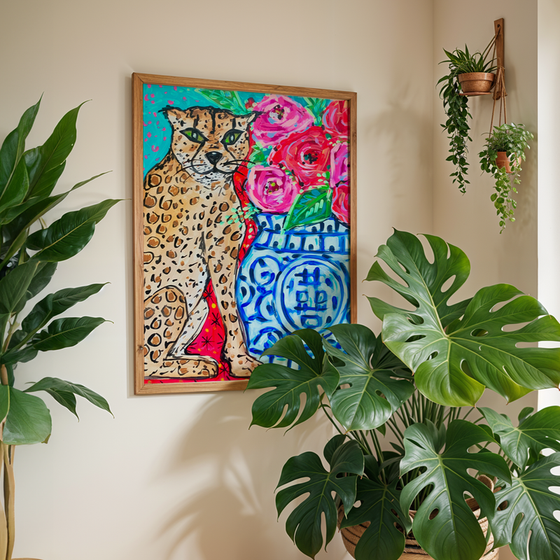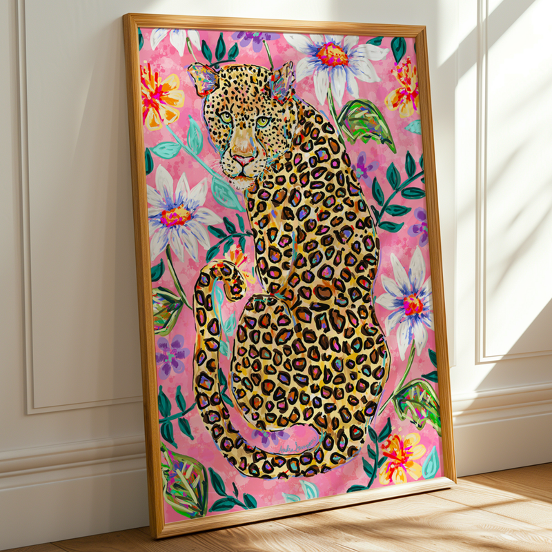 Leopard Print Floral Art Print, Cheetah Maximalist Art, Dopamine Decor, Trendy Colorful Wall Poster
