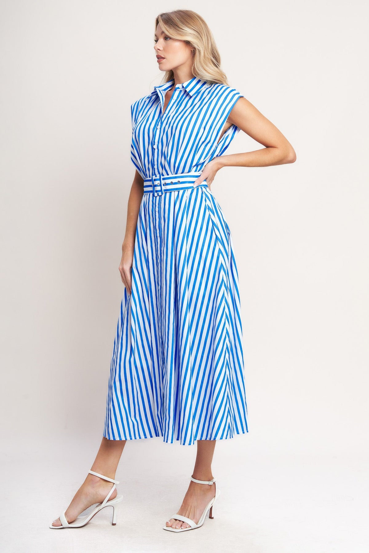 A striped woven midi dress featuring collar, short sleeve, front button down and self belt