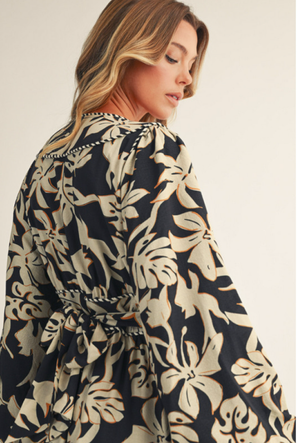 Wrap yourself in effortless elegance with the Enchanted Petals Maxi. This full-length wrap dress features a timeless floral print set against a bold dark backdrop, creating the perfect balance of romance and sophistication. Designed with long puff sleeves, a flattering waist tie, and subtle stripe contrast details, it’s a statement piece that moves gracefully from daytime chic to evening allure.