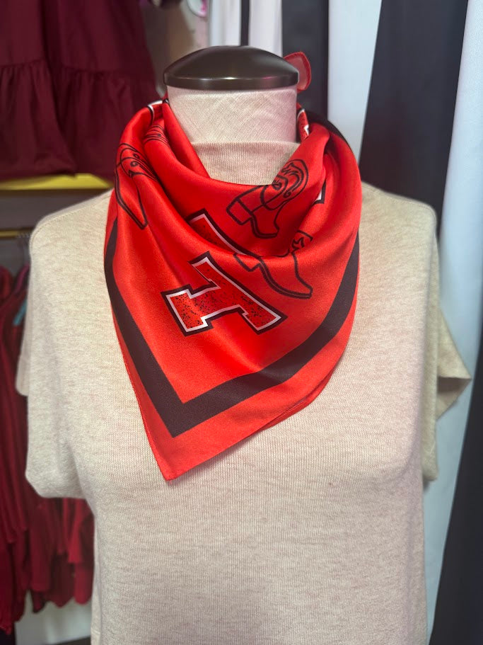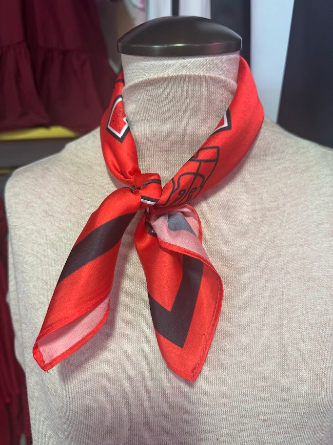 The perfect accessory to be the best dressed in the stands on gameday! Measures: 22" x 22" perfect for neck, hair or purse. Faux Silk: 100% polyester, one sided printing.