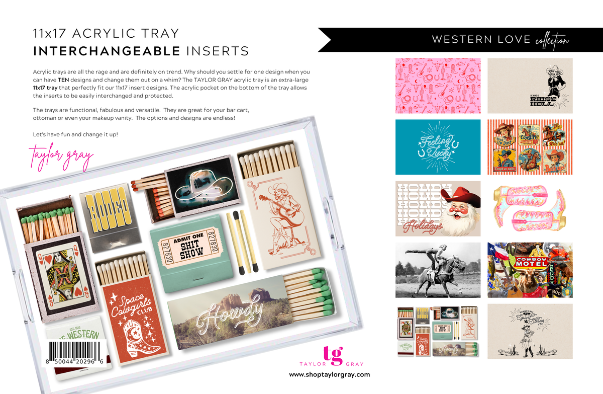 Howdy Y’all! Western vibes are hot, and trendy and we are jumping on the trend. It doesn’t hurt that our roots are here in Texas! Enjoy all the throwback matches, vintage cowgirls, boots and the sweetest most jolly cowboy Santa! Acrylic trays are all the rage and are definitely on trend. Why should customers settle for one design when they can have TEN designs and change them out on a whim? The TAYLOR GRAY acrylic tray is an extra-large 11x17 tray that perfectly fit our 11x17 insert designs. The patent pending pocket on the bottom of the tray allows the inserts to be easily interchanged and protected. The trays are functional, fabulous and extra-large. They are great for your bar cart, ottoman or even for makeup on your vanity. The options and designs are endless! ***LISTING IS FOR PAPER INSERTS & NOT ACRYLIC TRAY. TRAY SOLD SEPARATELY. ***