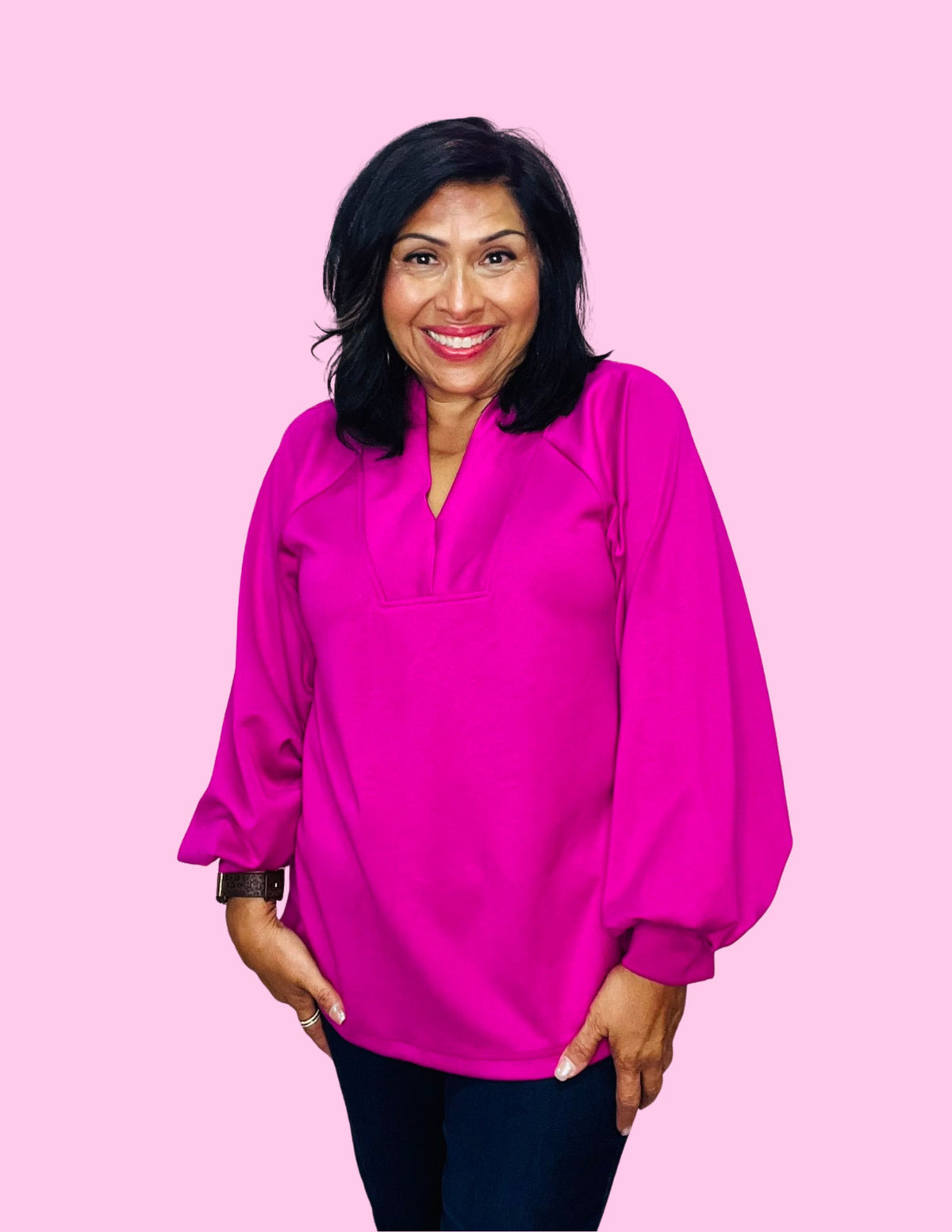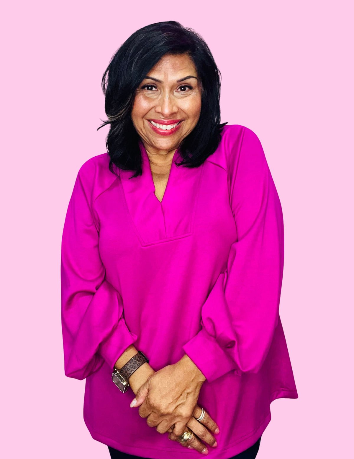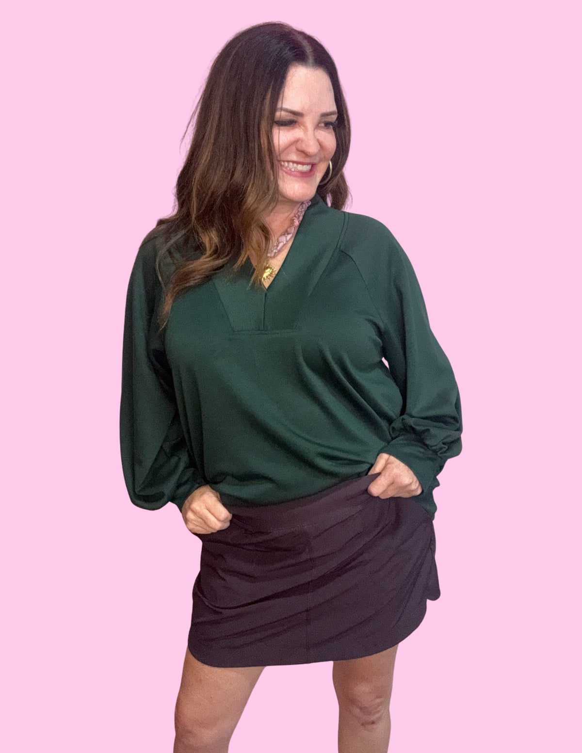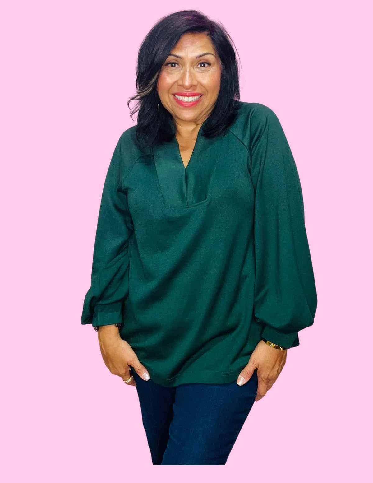 The Effortless Edit Top is where timeless style meets all-day comfort. With its relaxed fit, long raglan sleeves, and flattering V-neckline framed by a slightly high collar, this top is the definition of easy sophistication.