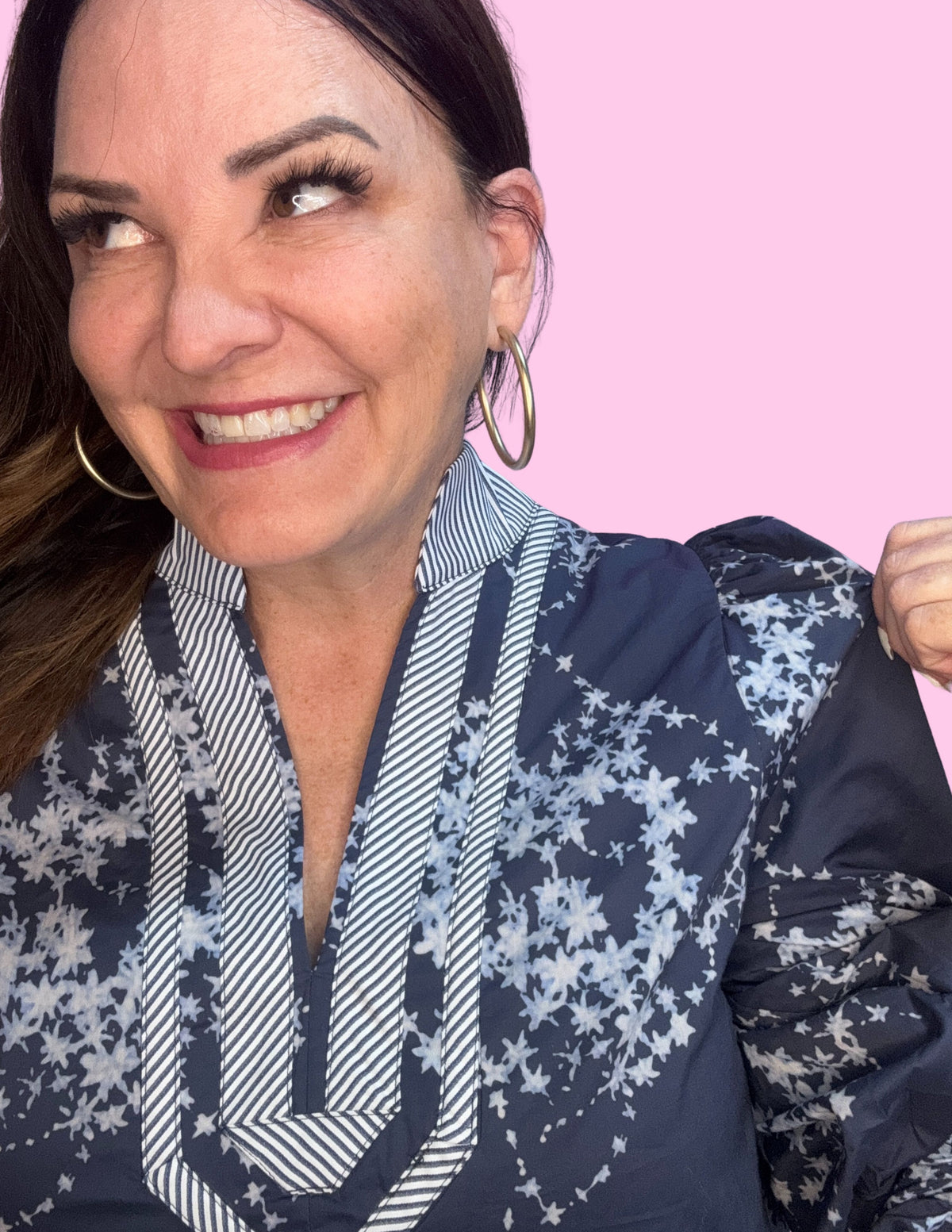 Navy floral print with stripe collar contrast