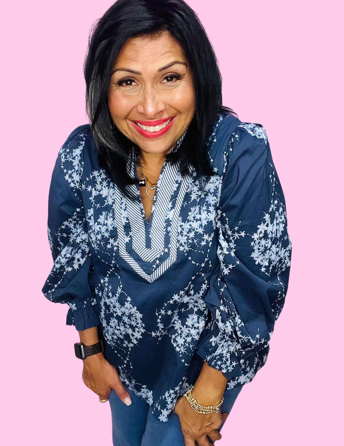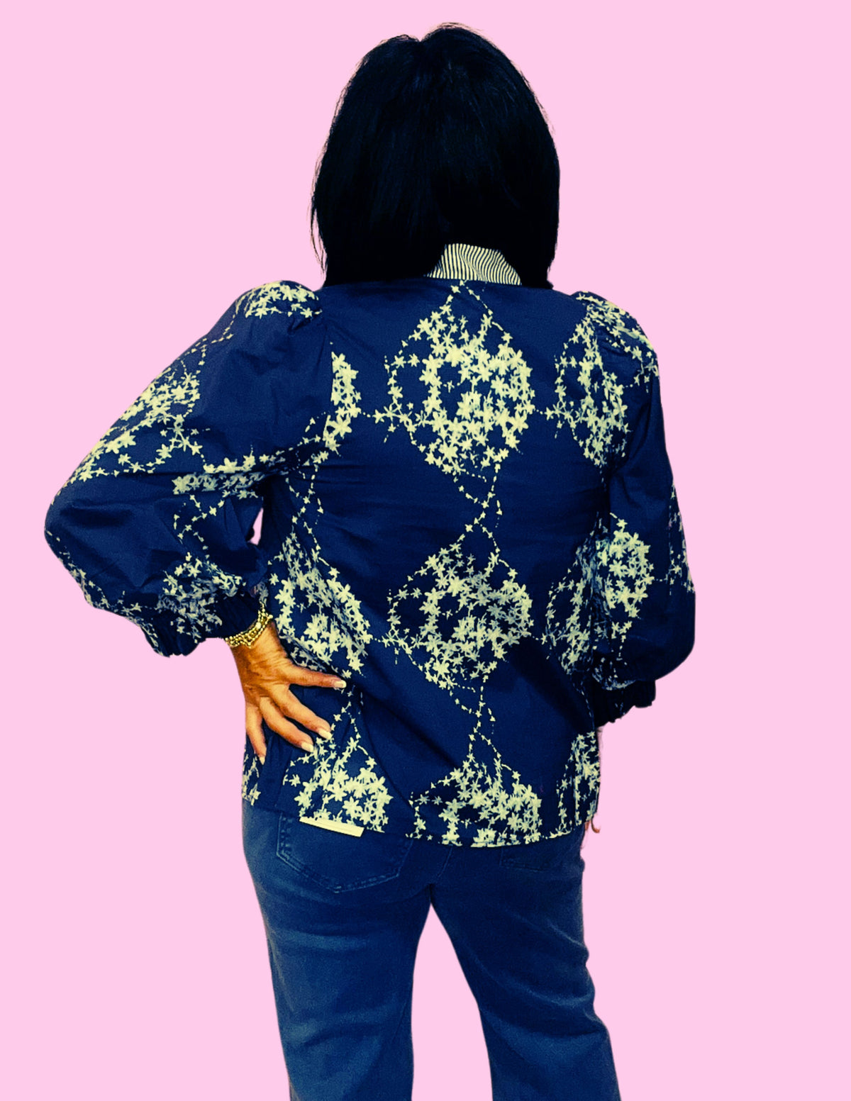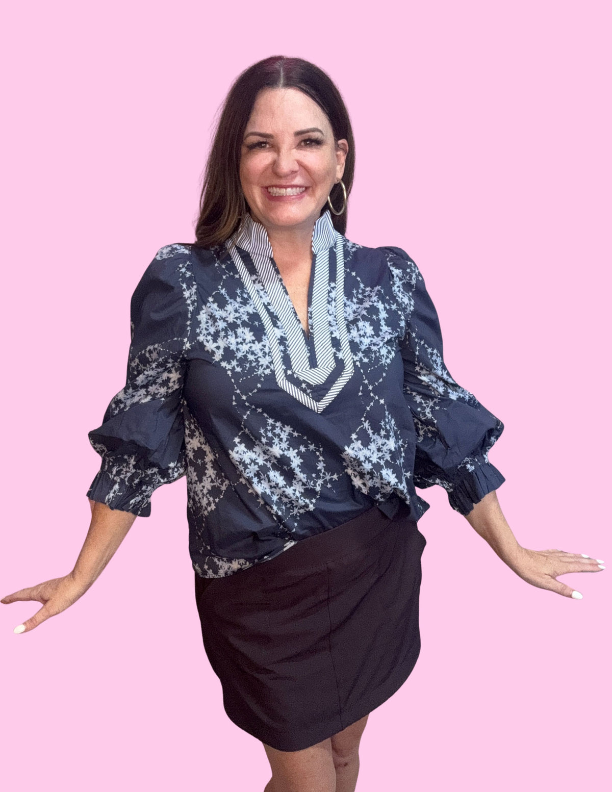 Bring a touch of chic charm to your everyday style with the Garden Stripe Blouse. Designed in a rich navy backdrop with delicate floral details, this blouse combines timeless femininity with a modern twist. The striped collar detailing adds a pop of contrast, while the puff 3/4 sleeves create an effortless statement.