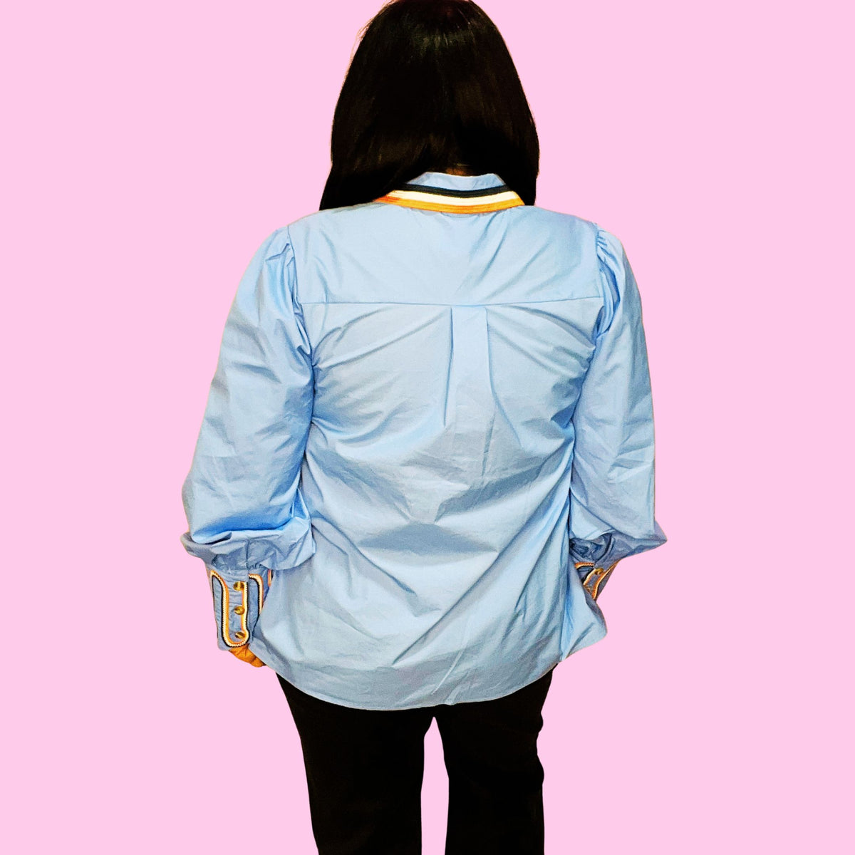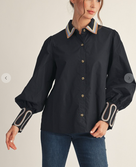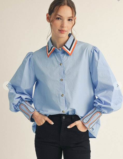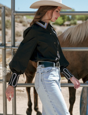 The standout collar gives varsity vibes with a rodeo-ready attitude, while the crisp fabric and wide cuffs keep things polished yet playful. Whether you're headed to brunch, the stockyards, or strutting into game day, this top says “I came to slay, not just stay.”