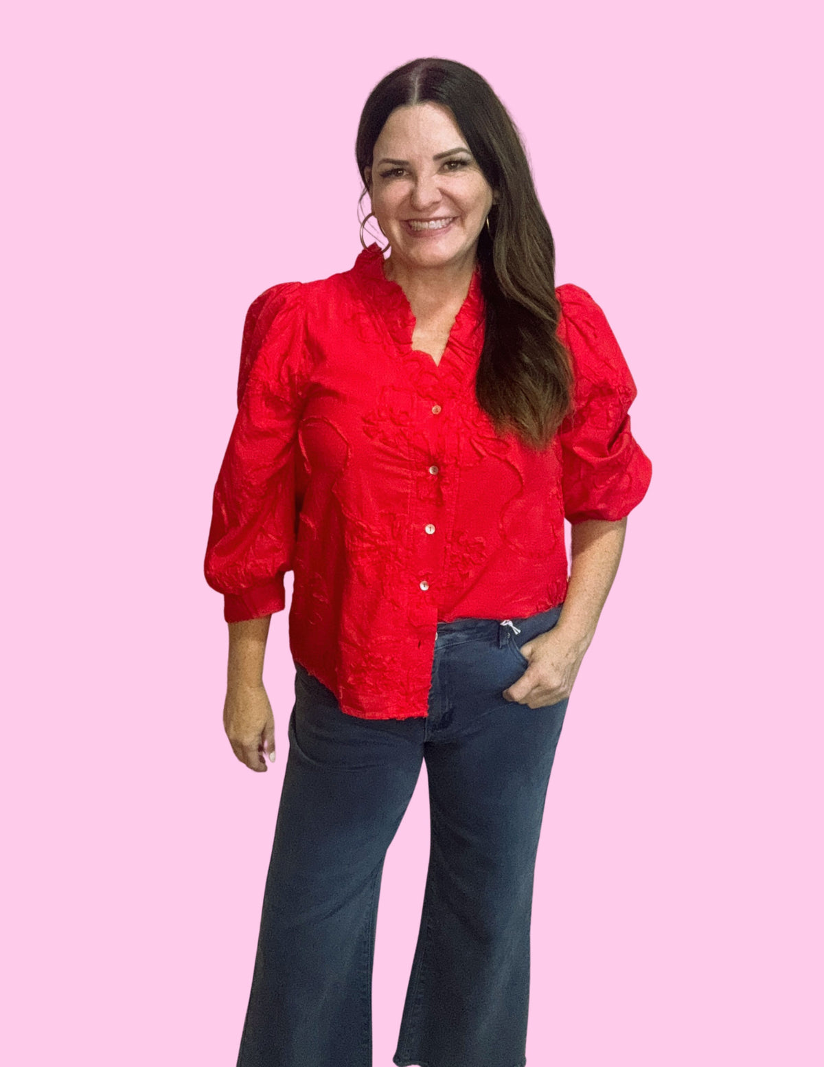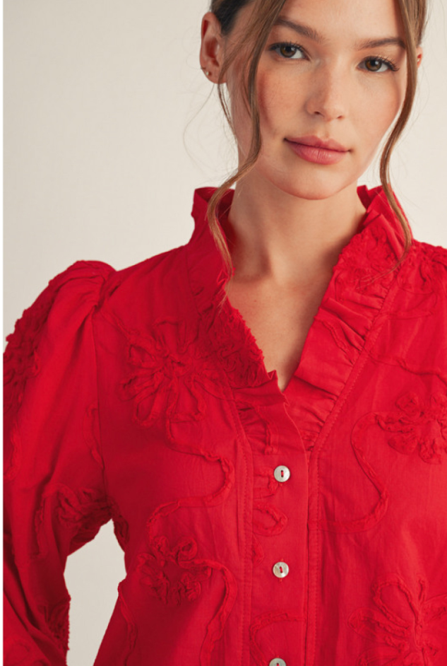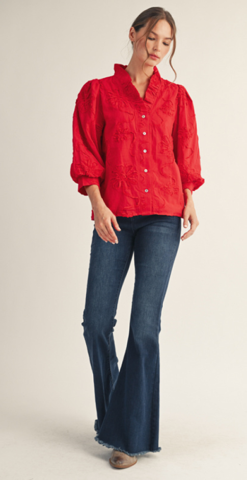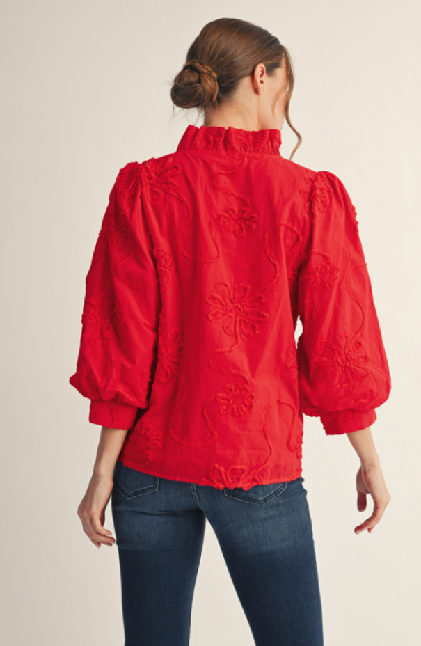 Elevate your wardrobe with the timeless romance of the Jardin Atelier Blouse—where artful embroidery meets refined design. Crafted from richly textured fabric, this button-down beauty features elegant 3D floral appliqué that blooms across the bodice like a couture garden. The softly ruffled neckline and voluminous ¾ sleeves add a touch of old-world charm, while the vibrant scarlet hue ensures you make an entrance.