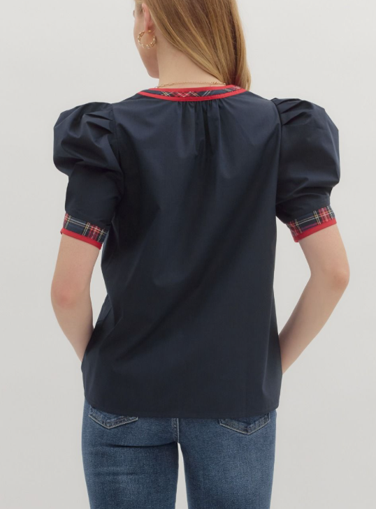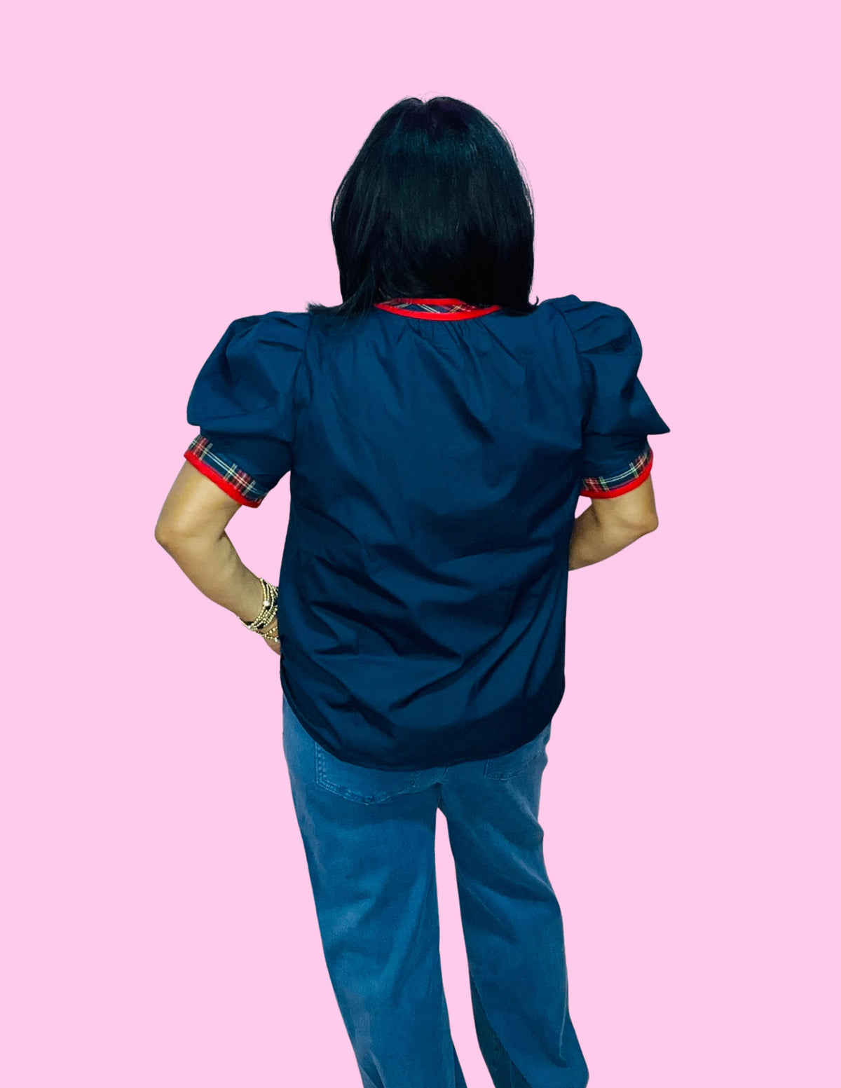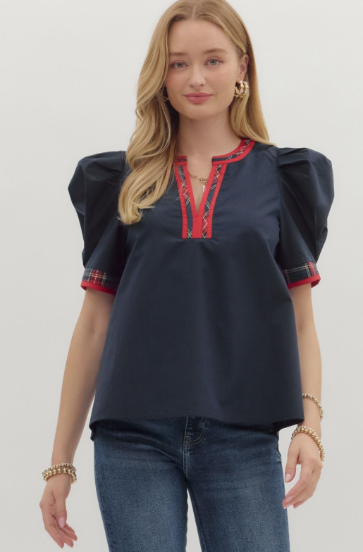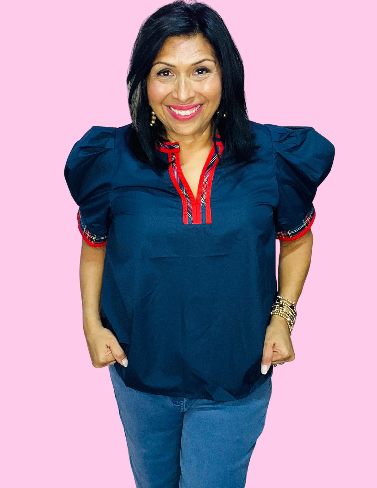 Bring festive spirit to your wardrobe with the Trimmed in Cheer Top. Designed in a classic navy with bold puff sleeves, this blouse is finished with red contrast accents and plaid trim at the neckline and sleeves—perfect for celebrating the season in style.