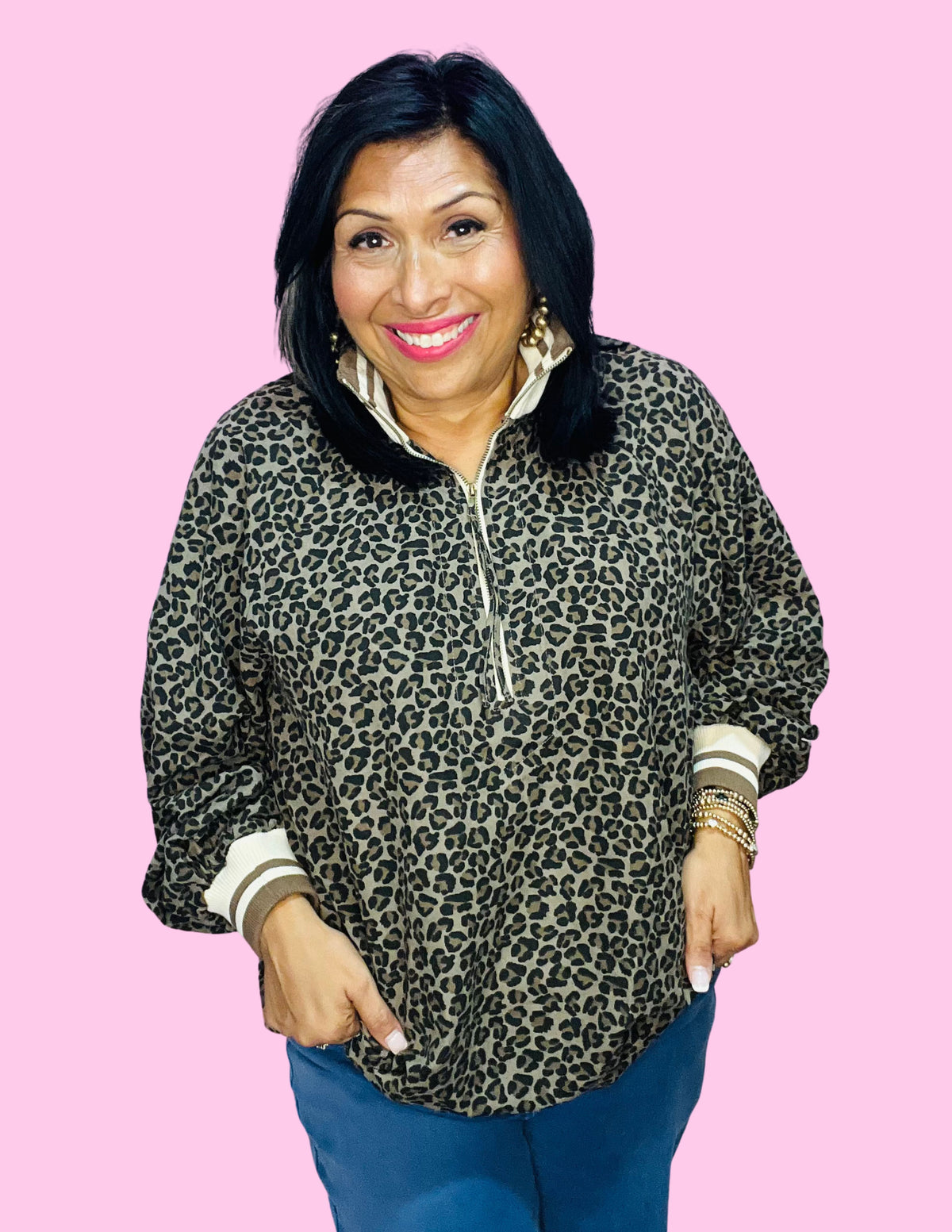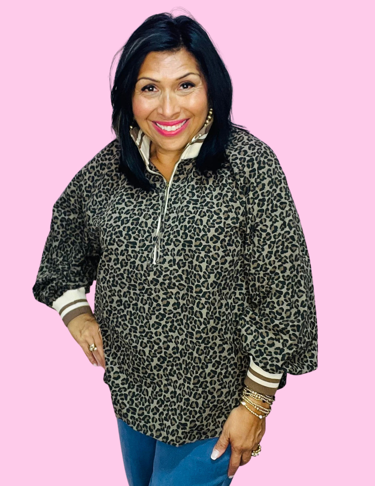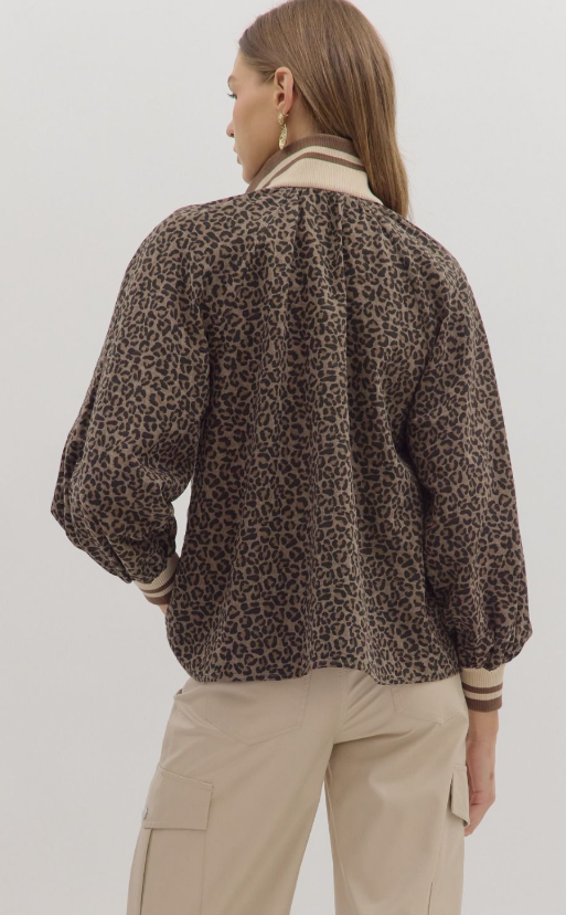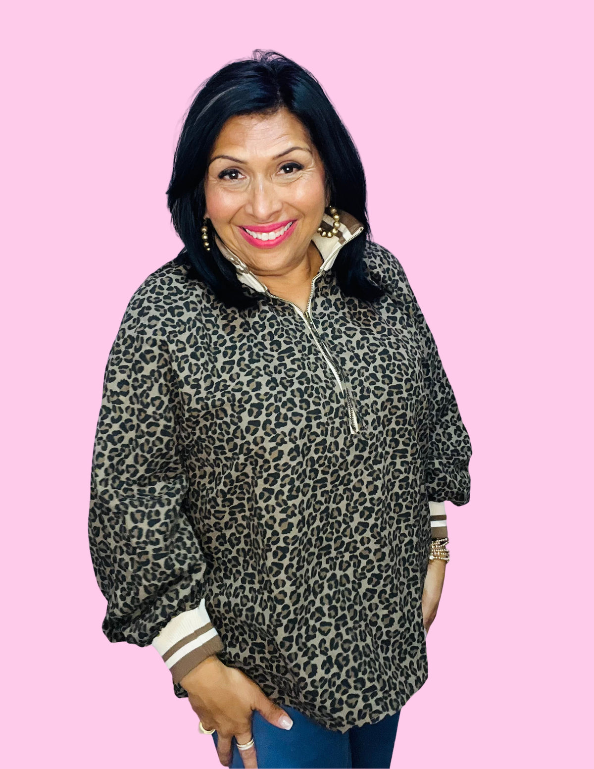 Take a walk on the wild side with the Urban Jungle Top, where city chic meets untamed edge. Designed in a bold leopard print, this long sleeve blouse features a modern zip-up mock neck that adds just the right amount of sleek detail.