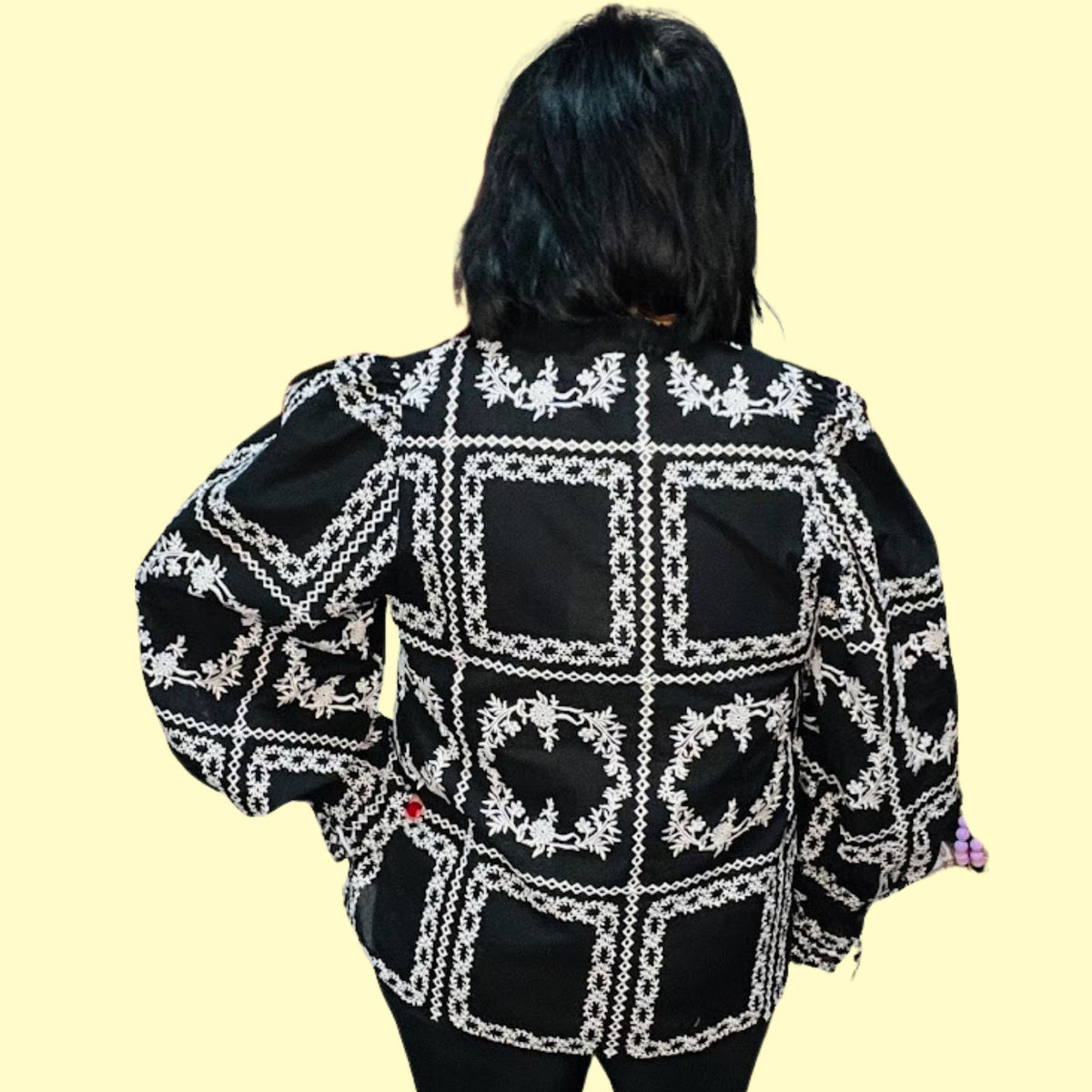 The Vintage Thread Blouse blends heirloom-inspired detail with modern versatility. Designed with intricate embroidery, delicate eyelet cutouts, and scalloped trim, this feminine embroidered blouse delivers timeless charm without feeling costume-y. It’s polished, refined, and quietly statement-making.