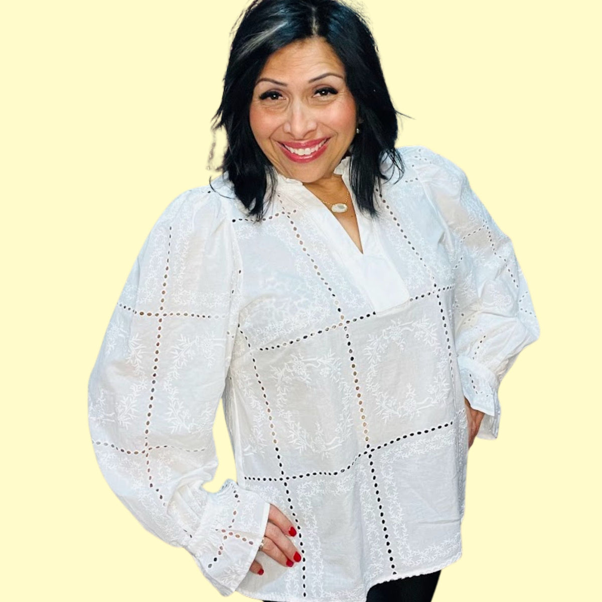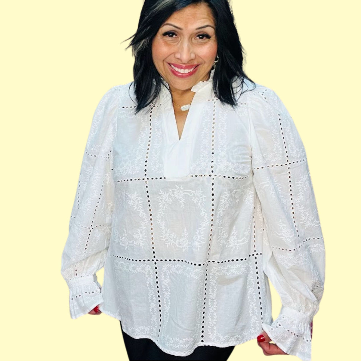 Perfect for layering with a cami or bralette, this semi-sheer eyelet blouse is ideal for transitional seasons and year-round styling.