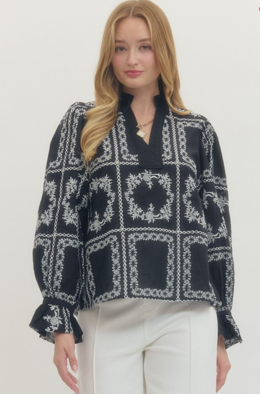 This long sleeve embroidered blouse creates graceful structure through the shoulders while maintaining an easy, wearable drape.
